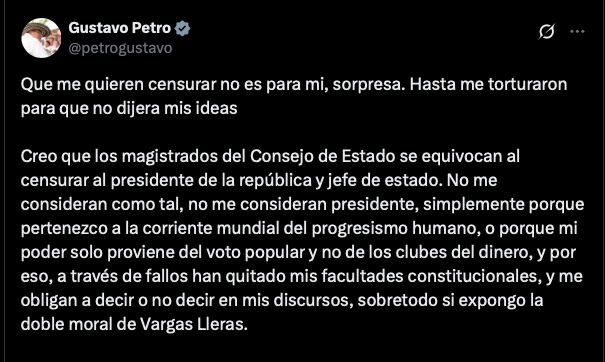 Por su parte, el presidente Petro en una extensa publcación en X dijo que esta determinación era un acto de censura, que fue, según dijo, fue influenciada por personas que no comparten su ideología política.