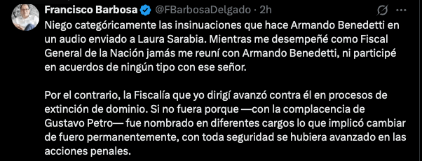 «Niego categóricamente las insinuaciones que hace Armando Benedetti en un audio enviado a Laura Sarabia. Mientras me desempeñé como Fiscal General de la Nación jamás me reuní con Armando Benedetti, ni participé en acuerdos de ningún tipo con ese señor», dijo en una publicación en X.