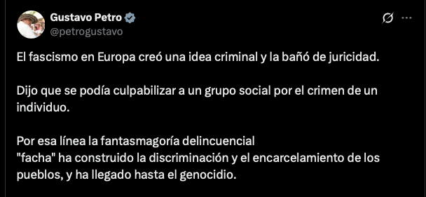 Igualmente el presidente Petro aseguró: “El fascismo en Europa creó una idea criminal y la bañó de juricidad. Dijo que se podía culpabilizar a un grupo social por el crimen de un individuo”.