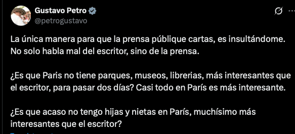 Tras revelarse el contenido de la carta por el propio excanciller Leyva, el presidente Petro escribió en su cuenta en X: “La única manera para que la prensa publique cartas, es insultándome. No solo habla mal del escritor, sino de la prensa”.