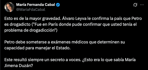 Sin embargo, desde la oposición surgieron duras críticas como la de la senadora del Centro Democrático, María Fernanda Cabal, quien en su cuenta en X señaló: «Esto es de la mayor gravedad. Álvaro Leyva le confirma la país que Petro es drogadicto («Fue en París donde pude confirmar que usted tenía el problema de drogadicción».