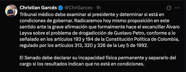 Incluso, el representante a la Cámara del Centro Democrático Christian Garcés dijo que un “Tribunal médico debe examinar al presidente y determinar si está en condiciones de gobernar”.