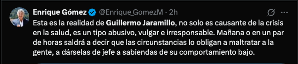 El excandidato presidencial Enrique Gómez, señaló: «Esta es la realidad de Guillermo Jaramillo, no solo es causante de la crisis en la salud, es un tipo abusivo, vulgar e irresponsable».