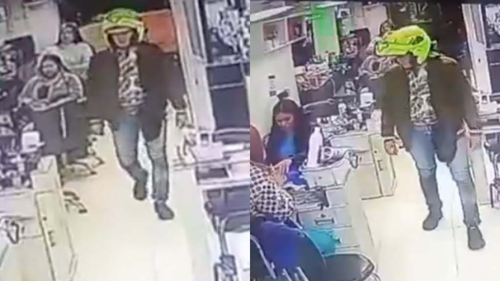 En las imágenes se puede apreciar cuando el efectivo de la Policía identificado como Andrés Julián Meza Ramírez, de 36 años, llega al negocio pasadas las 8:00 de la noche, vestido de civil, pero portando el casco de esa institución.
