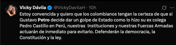 «Estoy convencida y quiero que los colombianos tengan la certeza de que si Gustavo Petro decide dar un golpe de Estado como lo hizo su ex colega Pedro Castillo en Perú, nuestras Instituciones y nuestras Fuerzas Armadas actuarán de inmediato para evitarlo. Defenderán la democracia, la Constitución y la ley. Los ciudadanos tampoco vamos a permitirlo», señaló la candidata presidencial, Vicky Dávila.