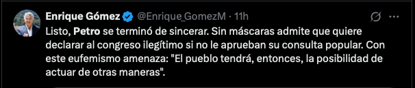 En ese mismo sentido se pronunció, el excandidato presidencial Enrique Gómez: «Listo, Petro se terminó de sincerar. Sin máscaras admite que quiere declarar al congreso ilegítimo si no le aprueban su consulta popular».