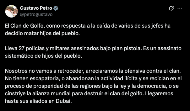 «El clan de Golfo, como respuesta a la caída de varios de sus jefes, ha decidido matar a hijos del pueblo», manifestó el mandatario en un mensaje publicado en su cuenta de X .
