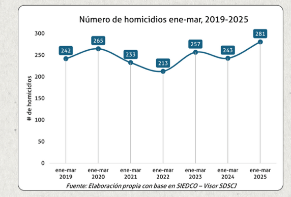 “El primer trimestre de 2025 se perfila como el más violento en términos de homicidios desde 2019. A corte del 31 de marzo se registraron 281 homicidios en Bogotá, lo que representa un aumento del 18,5% frente al mismo periodo del año anterior”, según el reporte.