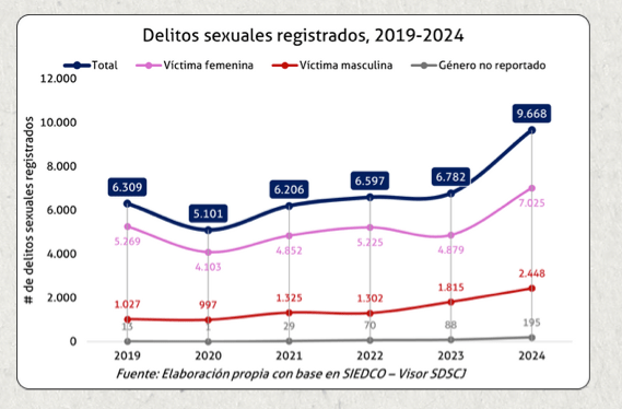 En 2024, el 75% de las víctimas de delitos sexuales y el 73% de las víctimas de violencia intrafamiliar fueron mujeres, lo que reafirma la necesidad de políticas con enfoque de género robustas y eficaces.