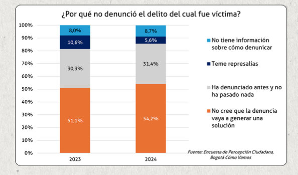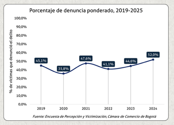Uno de los aspectos positivos del informe es el crecimiento en el número de denuncias. Mientras que en 2023 sólo el 44,6% de las personas que fueron víctimas de algún delito lo reportaron, en 2024 esa cifra subió al 52 %.