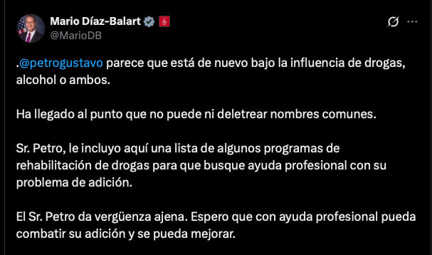 De inmediato, el senador estadounidense le respondió: “Gustavo Petro parece que está de nuevo bajo la influencia de drogas, alcohol o ambos.Ha llegado al punto que no puede ni deletrear nombres comunes”.