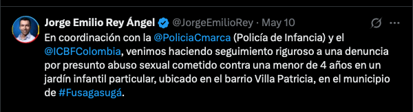 Este caso fue dado a conocer por el Gobernador de Cundinamarca, Jorge Rey Ángel, quien dijo que “en coordinación con la Policía de Infancia y el ICBF venimos haciendo seguimiento riguroso a una denuncia por presunto abuso sexual cometido contra una menor de 4 años en un jardín infantil particular, ubicado en el barrio Villa Patricia”.
