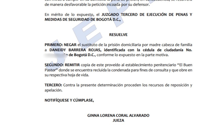“En ese orden de ideas y conforme a los elementos de juicio allegados, no se advierte que DANEIDY BARRERA ROJAS ostente la condición de “madre cabeza de familia” con miras a cumplir en su domicilio la pena de prisión; en consecuencia, se resolverá de manera desfavorable la petición incoada por su defensor”, establece la decisión.