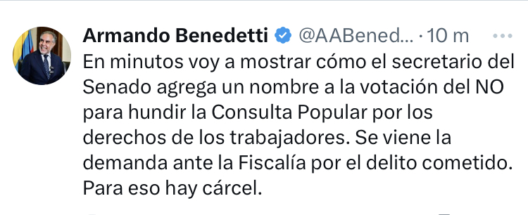 En otro mensaje, anunció: «En minutos voy a mostrar cómo el secretario del Senado agrega un nombre a la votación del NO para hundir la Consulta Popular por los derechos de los trabajadores. Se viene la demanda ante la Fiscalía por el delito cometido. Para eso hay cárcel».
