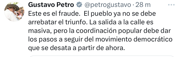 En otro mensaje, el mandatario aseguró: «Este es el fraude. El pueblo ya no se debe (sic) arrebatar el triunfo. La salida a la calle es masiva, pero la coordinación popular debe dar los pasos a seguir del movimiento democrático que se desata a partir de ahora».