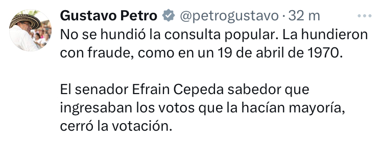 Por su parte, el presidente Gustavo dijo a través de su cuenta en X «No se hundió la consulta popular. La hundieron con fraude, como un 19 de abril de 1970».