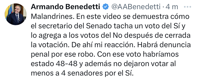 Al publicar un video con el que sustentó su denuncia de fraude, Benedetti escribió: «Malandrines. En este video se demuestra cómo el secretario del Senado tacha un voto del Sí y lo agrega a los votos del No después de cerrada la votación. De ahí mi reacción»