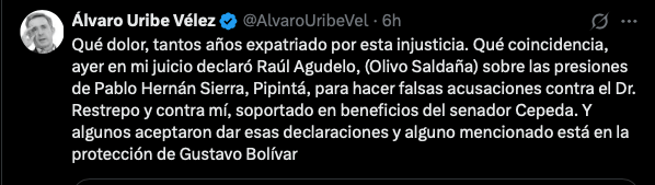 “Qué coincidencia, ayer en mi juicio declaró Raúl Agudelo, (Olivo Saldaña) sobre las presiones de Pablo Hernán Sierra, Pipintá, para hacer falsas acusaciones contra el Dr. Restrepo y contra mí, soportado en beneficios del senador Cepeda. Y algunos aceptaron dar esas declaraciones y alguno mencionado está en la protección de Gustavo Bolívar”, indicó.