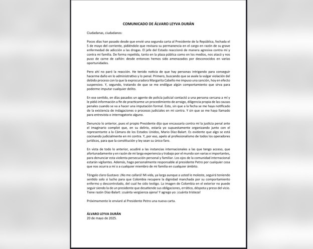 El excanciller indicó que, luego de sus dos primeras cartas, el presidente Petro reaccionó de manera agresiva contra él y su familia: “Nos atacó y nos puso de carne de cañón: desde entonces hemos sido amenazados por desconocidos en varias oportunidades”, por lo que lo hizo responsable si algo le pasa a él o a su familia “en cualquier ámbito”.