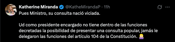 “Pues Ministro, su consulta nació viciada. Ud como presidente encargado no tiene dentro de las funciones decretadas la posibilidad de presentar una consulta popular, jamás le delegaron las funciones del artículo 104 de la Constitución”, comentó la congresista en su mensaje de la red social X.