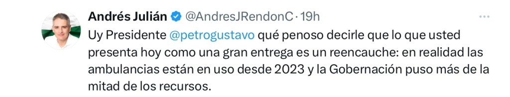 “Uy presidente Gustavo Petro, qué penoso decirle que lo que usted presenta hoy como una gran entrega es un reencauche: en realidad las ambulancias están en uso desde 2023 y la Gobernación puso más de la mitad de los recursos”, señaló el Gobernador.