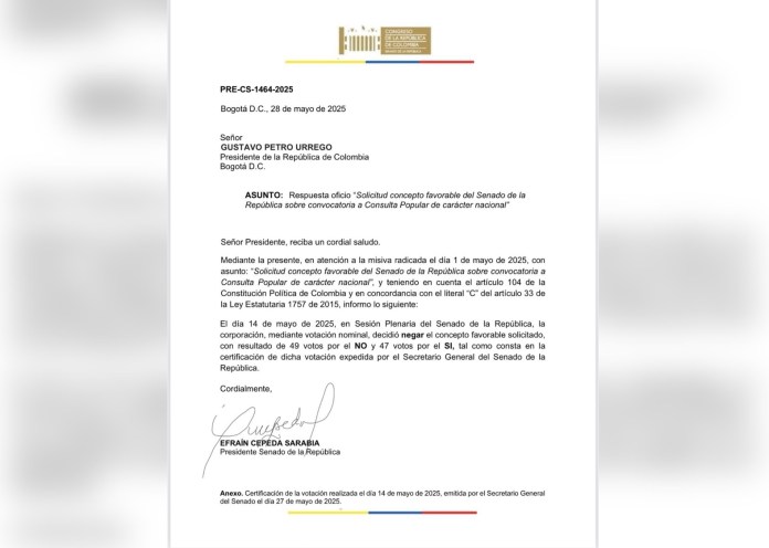 “El día 14 de mayo de 2025, en sesión plenaria del Senado de la República, la corporación, mediante votación nominal, decidió negar el concepto favorable solicitado, con resultado de 49 votos por el No y 47 votos por el Sí”, de acuerdo con la misiva de Cepeda.