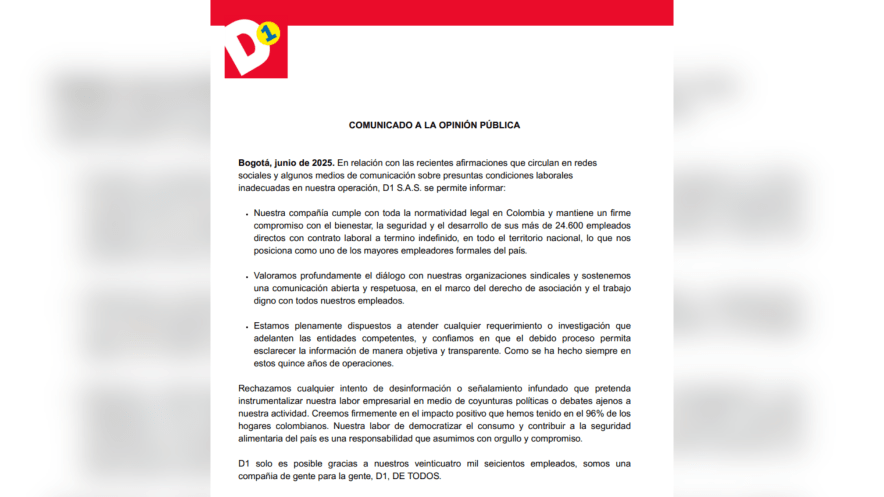 “La compañía cumple con toda la normatividad legal en Colombia y mantiene un firme compromiso con el bienestar, la seguridad y el desarrollo de sus más de 24.600 empleados directos con contrato laboral a término indefinido, en todo el territorio nacional”, señaló a través de un comunicado.