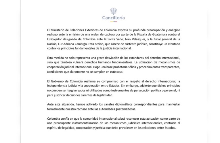 Por su parte, la Cancillería colombiana emitió un comunicado en el que expresó “su profunda preocupación y enérgico rechazo ante la orden de captura emitida por la Fiscalía de Guatemala contra Iván Velásquez, embajador designado ante la Santa Sede, y Luz Adriana Camargo, fiscal general de la Nación”.