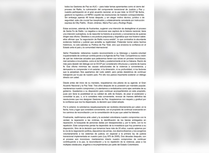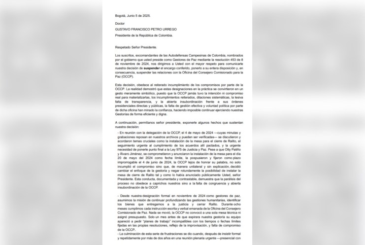 “Los suscritos, excomandantes de las Autodefensas Campesinas de Colombia, nombrados por el gobierno que usted preside como Gestores de Paz mediante la resolución 453 de 8 de noviembre de 2024, nos dirigimos a usted con el mayor respeto para comunicarle nuestra decisión de suspender el encargo conferido, ponerlo a su entera disposición y, en consecuencia, suspender las relaciones con la Oficina del Consejero Comisionado para la Paz”, de acuerdo con la carta al mandatario.