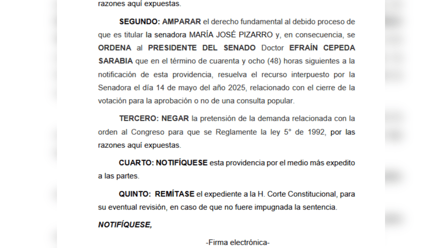 La juez determinó que en en ese lapso se debe resolver el «recurso interpuesto por la senadora del 14 de mayo del año 2025, relacionado con el cierre la votación para la aprobación o no hay una consulta popular”, con el propósito de amparar el derecho fundamental al debido proceso.