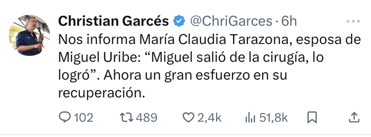 «Nos informa María Claudia Tarazona, esposa de Miguel Uribe: ‘Miguel salió de la cirugía, lo logró’. Ahora un gran esfuerzo en su recuperación», escribió en la red social X el representante a la Cámara Christian Garcés.