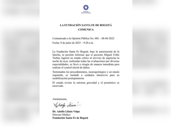 El senador y precandidato presidencial, Miguel Uribe sigue extremadamente grave, según el último parte médico publicado por el hospital de la Fundación Santa Fe, donde fue intervenido de urgencia tras recibir dos disparos por la espalda durante una concentración política en Bogotá.