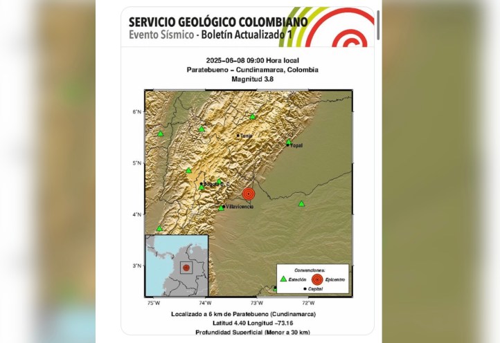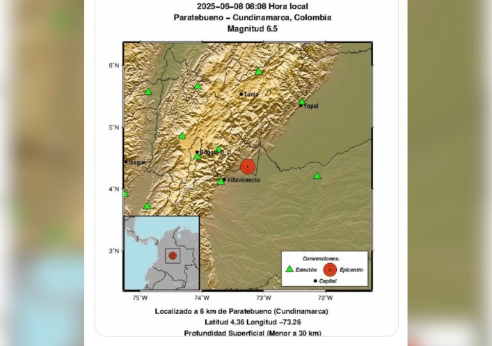 «Evento Sísmico – Boletín Actualizado 1, 2025-06-08, 08:08 hora local Magnitud 6.5, Profundidad Superficial (Menor a 30 km), Paratebueno – Cundinamarca, Colombia», reportó la entidad.