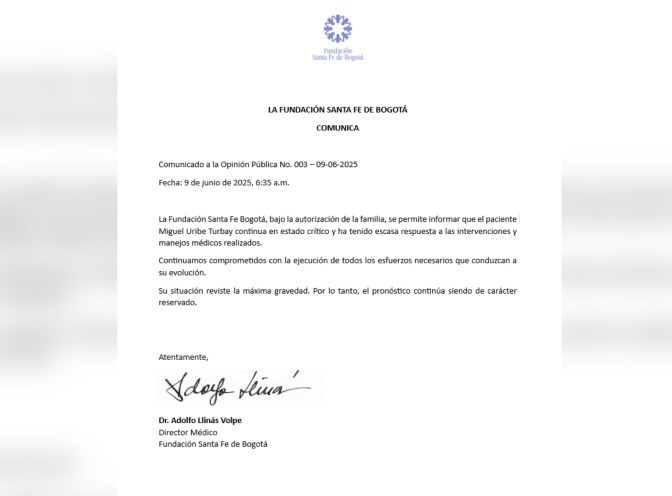“La Fundación Santa Fe de Bogotá, bajo la autorización de la familia, se permite informar que el paciente Miguel Uribe Turbay continúa en estado crítico y ha tenido escasa respuesta a las intervenciones y manejos médicos realizados”, de acuerdo con el comunicado.