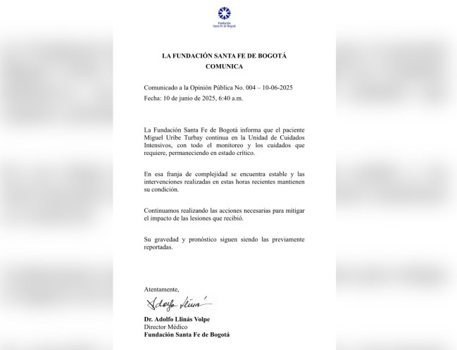 “La Fundación Santa Fe de Bogotá informa que el paciente Miguel Uribe Turbay continúa en la unidad de cuidados intensivos con todo el monitoreo y los cuidados que requiere, permaneciendo en estado crítico”, señala el documento.