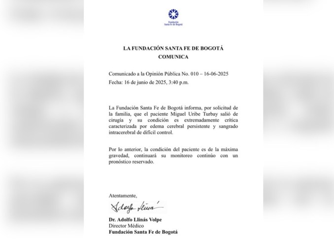 «El paciente Miguel Uribe Turbay salió de cirugía y su condición es extremadamente crítica caracterizada por edema cerebral persistente y sangrado intercerebral de difícil control», añadió.
