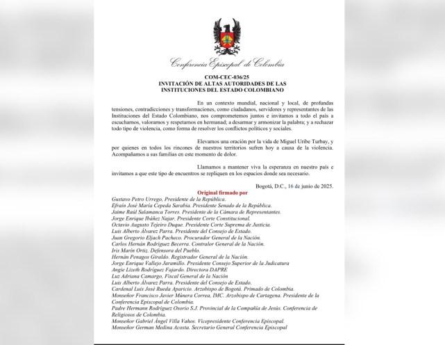 «Elevamos una oración por la vida de Miguel Uribe Turbay, y por quienes en todos los rincones de nuestros territorios sufren hoy a causa de la violencia. Acompañamos a sus familias en este momento de dolor», de acuerdo con el documento.