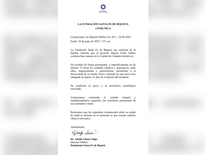 La Fundación Santa Fe detalló este martes que al candidato presidencial y senador, Miguel Uribe se le adelantaron en las últimas 72 horas «cuidados médicos y quirúrgicos».