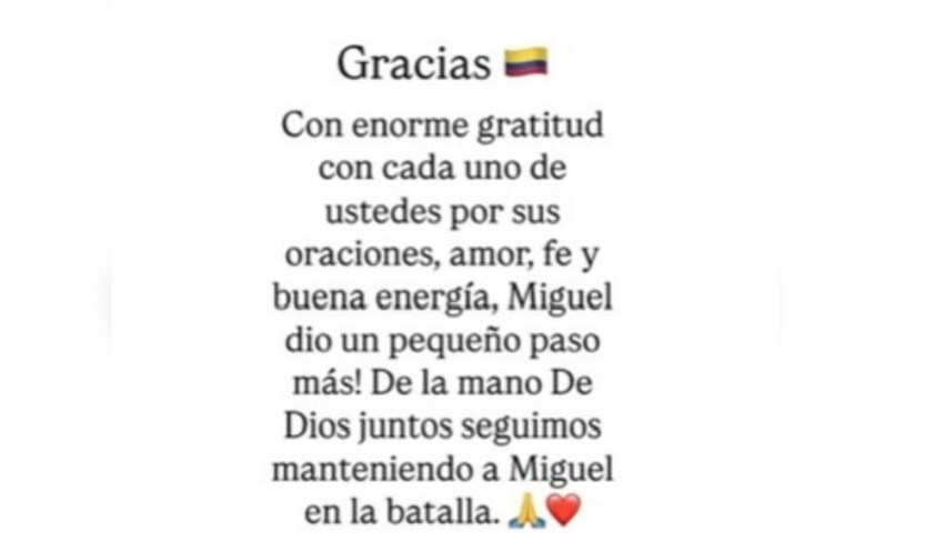 “Miguel dio un pequeño paso más! De la mano de Dios juntos seguimos manteniendo a Miguel en la batalla”, puntualizó.