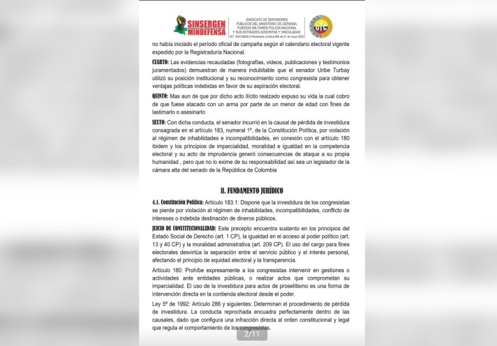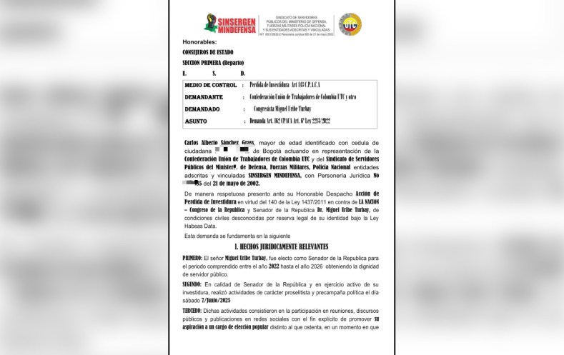 La Confederación Unión de Trabajadores de Colombia y el sindicato de servidores públicos del Ministerio de Defensa, Fuerzas Militares y Policía Nacional, entidades adscritas y vinculadas SINSERGEN MINDEFENSA, radicaron ante el Consejo de Estado, una demanda de pérdida de investidura al precandidato presidencial y senador Miguel Uribe Turbay.
