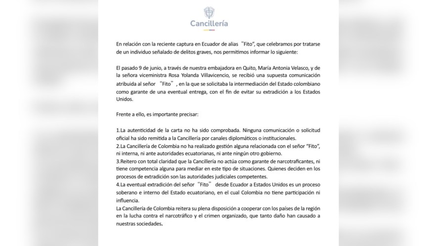 Por su parte, la Cancillería aclaró que no ha recibido solicitud alguna ni ha realizado gestiones diplomáticas o institucionales relacionadas con alias “Fito”, ni ha sido notificada por ningún canal oficial sobre una eventual intermediación en su proceso judicial.