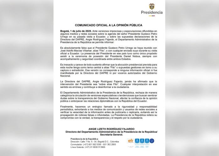 “El Departamento Administrativo de la Presidencia de la República rechaza de manera categórica la circulación de versiones especulativas o tendenciosas que buscan sembrar dudas sobre la transparencia del Gobierno nacional, afectar la confianza de la opinión pública o entorpecer las relaciones diplomáticas con la República del Ecuador”, destacó.