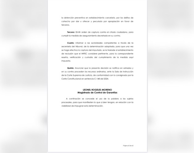 «Informar a las autoridades competentes a través de la secretaría del tribunal, de la determinación adoptada, para que una vez se haga efectiva la captura del imputado, se le traslade al establecimiento de reclusión que el INPEC considere pertinente, para la correspondiente reseña, verificación y custodia del cumplimiento de la medida aquí impuesta», advierte el documento.