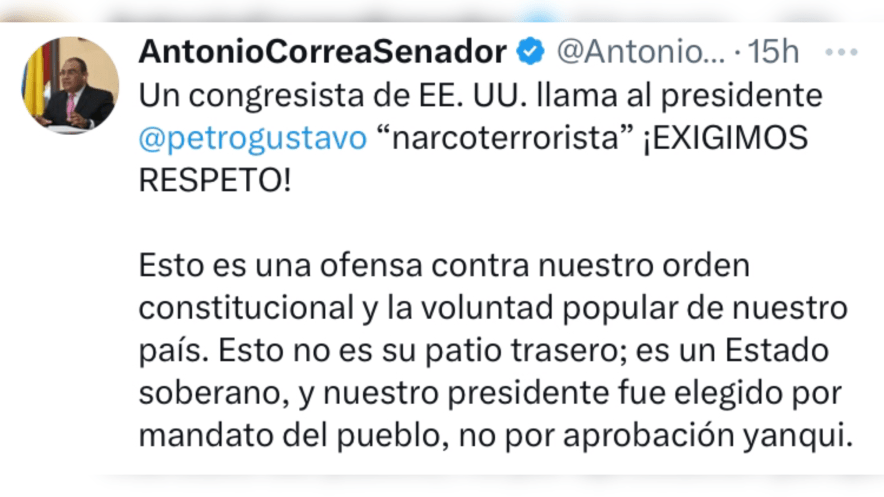 El senador del Partido de la U, Antonio Correa uno de los firmantes de la carta rechazó también las declaraciones de uno de los congresistas estadounidenses, Carlos Antonio Giménez quien llamó al presidente Petro de “matón narcoterrorista socialista que vive en la Casa de Nariño”.