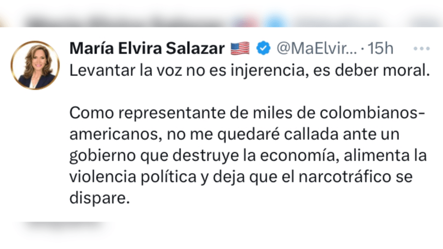 La representante, María Elvira Sazalar señaló: “Levantar la voz no es injerencia, es deber moral. Como representante de miles de colombianos-americanos, no me quedaré callada ante un gobierno que destruye la economía, alimenta la violencia política y deja que el narcotráfico se dispare”.