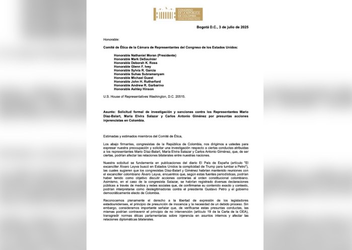 30 congresistas colombianos de la bancada del Gobierno Petro solicitaron al Comité de Ética de la Cámara de Representantes del Congreso de los Estados Unidos, investigar y sancionar a los representantes Mario Díaz-Balart, María Elvira Salazar y Carlos Antonio Giménez “por presuntas acciones injerencistas en Colombia”.