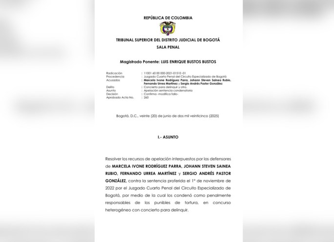 El Tribunal Superior de Bogotá confirmó la sentencia condenatoria contra cuatro miembros de la Primera Línea del Portal Américas, quienes fueron hallados culpables de los delitos de tortura y concierto para delinquir agravado.