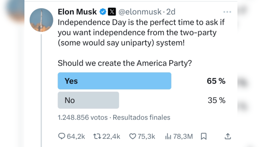 El magnate realizó una encuesta a través de su red social X «El Día de la Independencia es el momento perfecto para preguntar si quieres independizarte del sistema bipartidista (algunos dirían unipartidista). ¿Deberíamos crear el Partido América?»