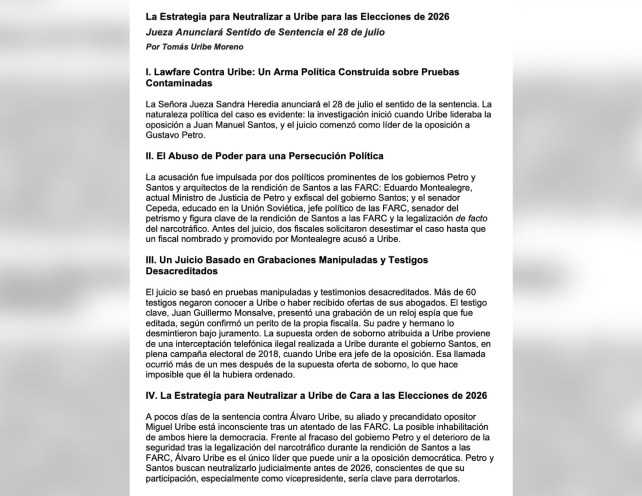 Igualmente, indicó que “el juicio se basó en pruebas manipuladas y testimonios desacreditados. Más de 60 testigos negaron conocer a Uribe o haber recibido ofertas de sus abogados”.