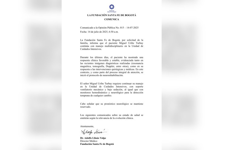 La Fundación Santa Fe emitió un nuevo parte médico sobre el estado de salud del precandidato presidencial y senador del Centro Democrático, Miguel Uribe Turbay en el que señala que «presenta una respuesta clínica favorable».